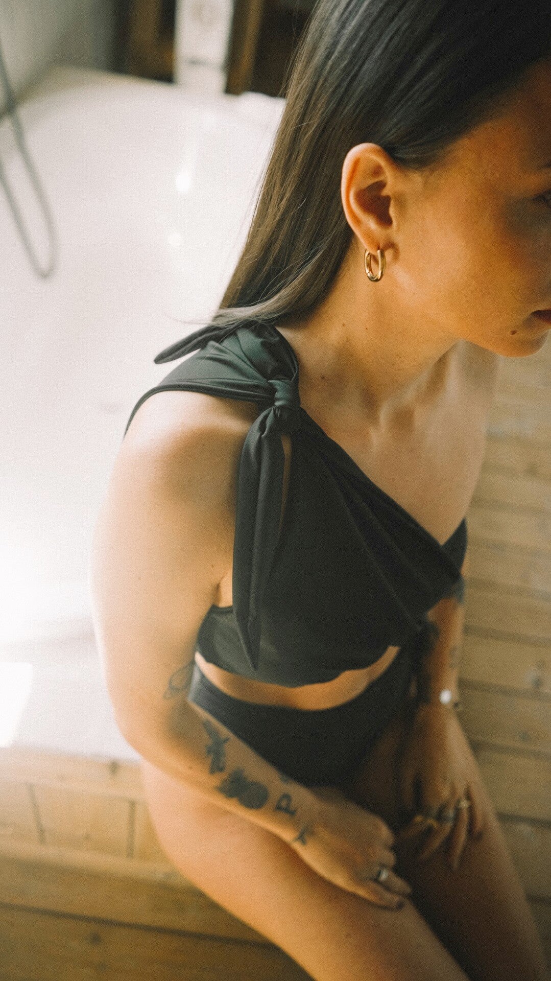 Bikini with asymmetric strap adjustable on the shoulder. High-waisted ruched bikini bottom. Without cups and without hoop.