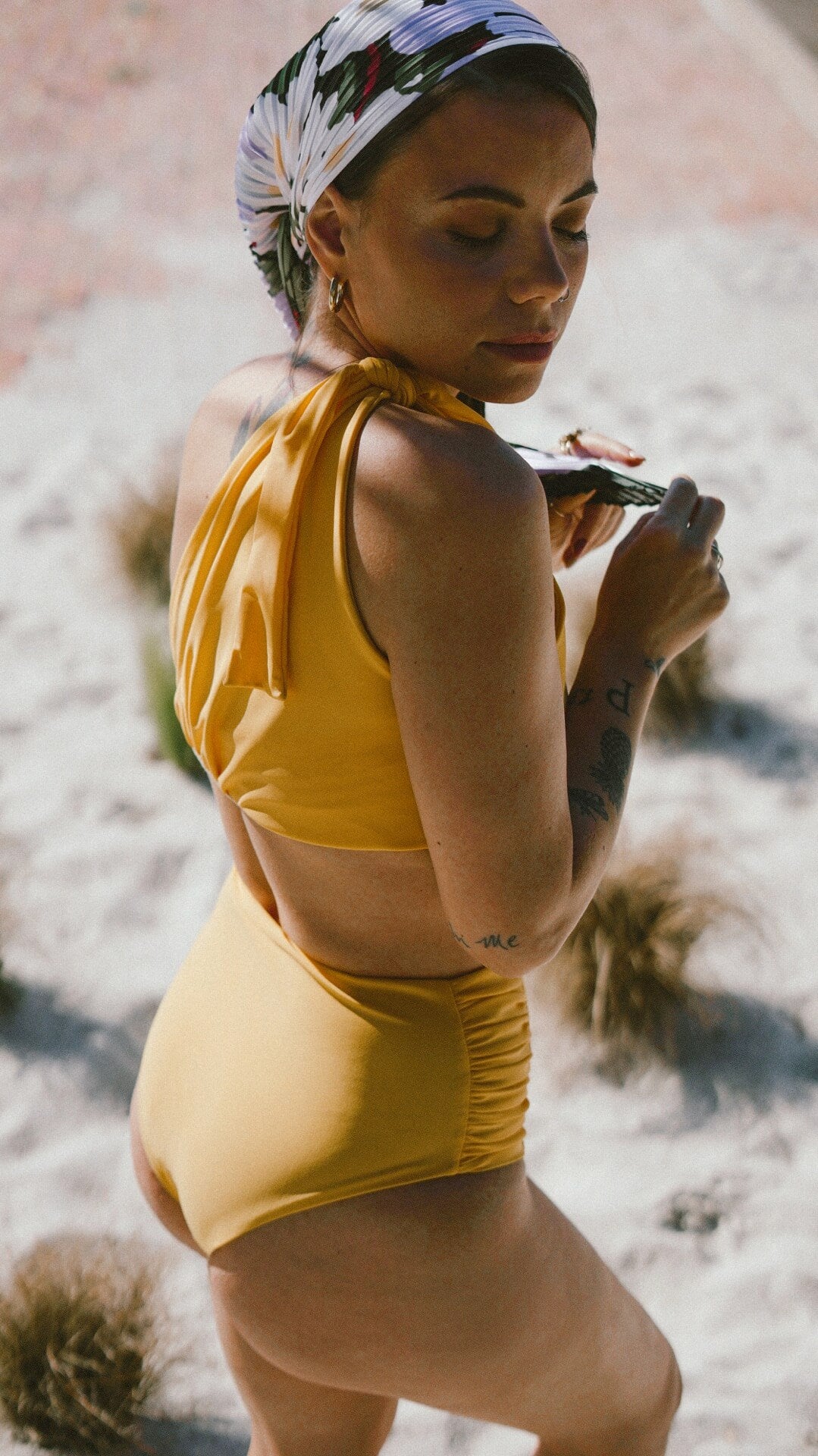 Biquíni com alça assimétrica ajustável no ombro. Cueca com pormenor das lateral drapeadas e cintura subida. Sem copas e sem aros.
