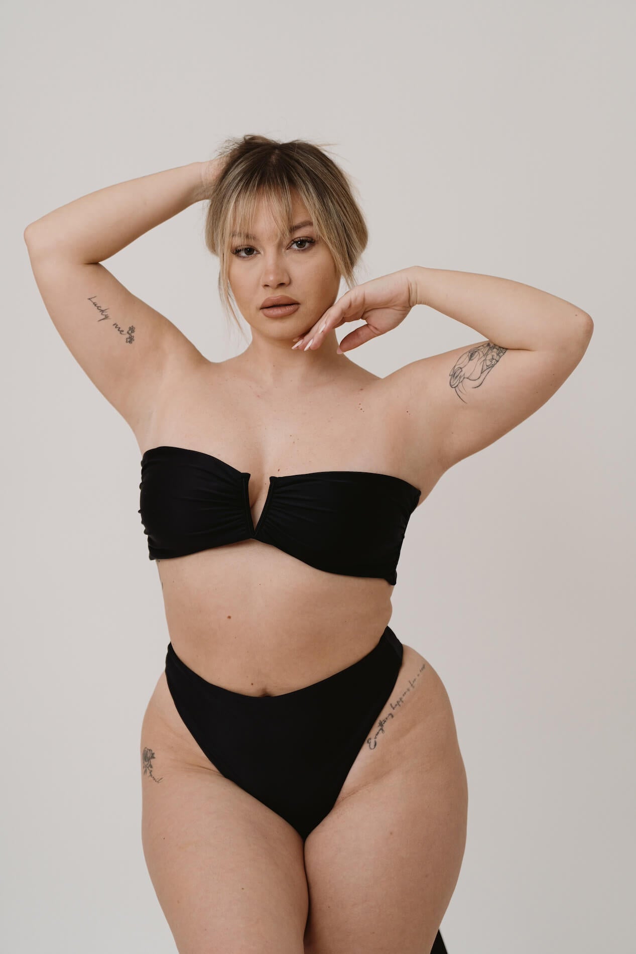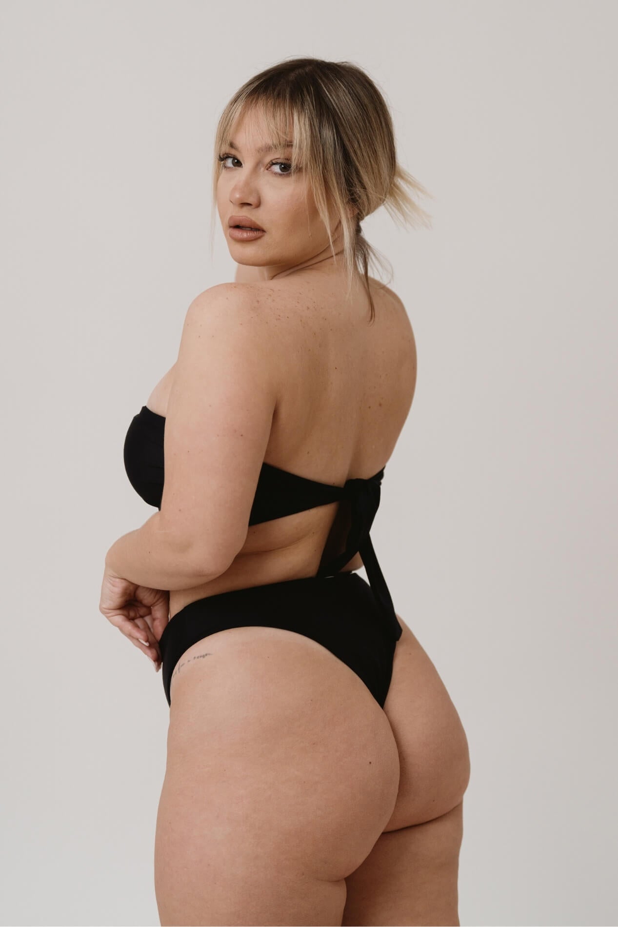 Biquíni cai-cai ajustável nas costas. Decote com detalhe em “V”. Copas removíveis. Parte de baixo de cintura subida. Tecido duplo para maior conforto e suporte inigualável. As modelos estão a usar o tamanho S e L.